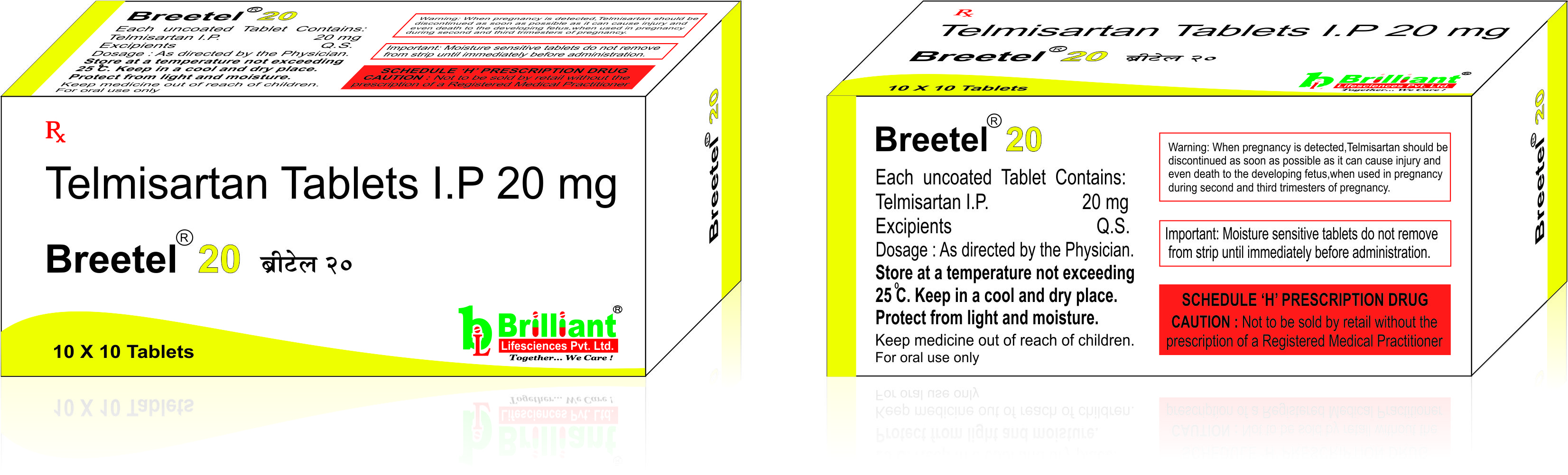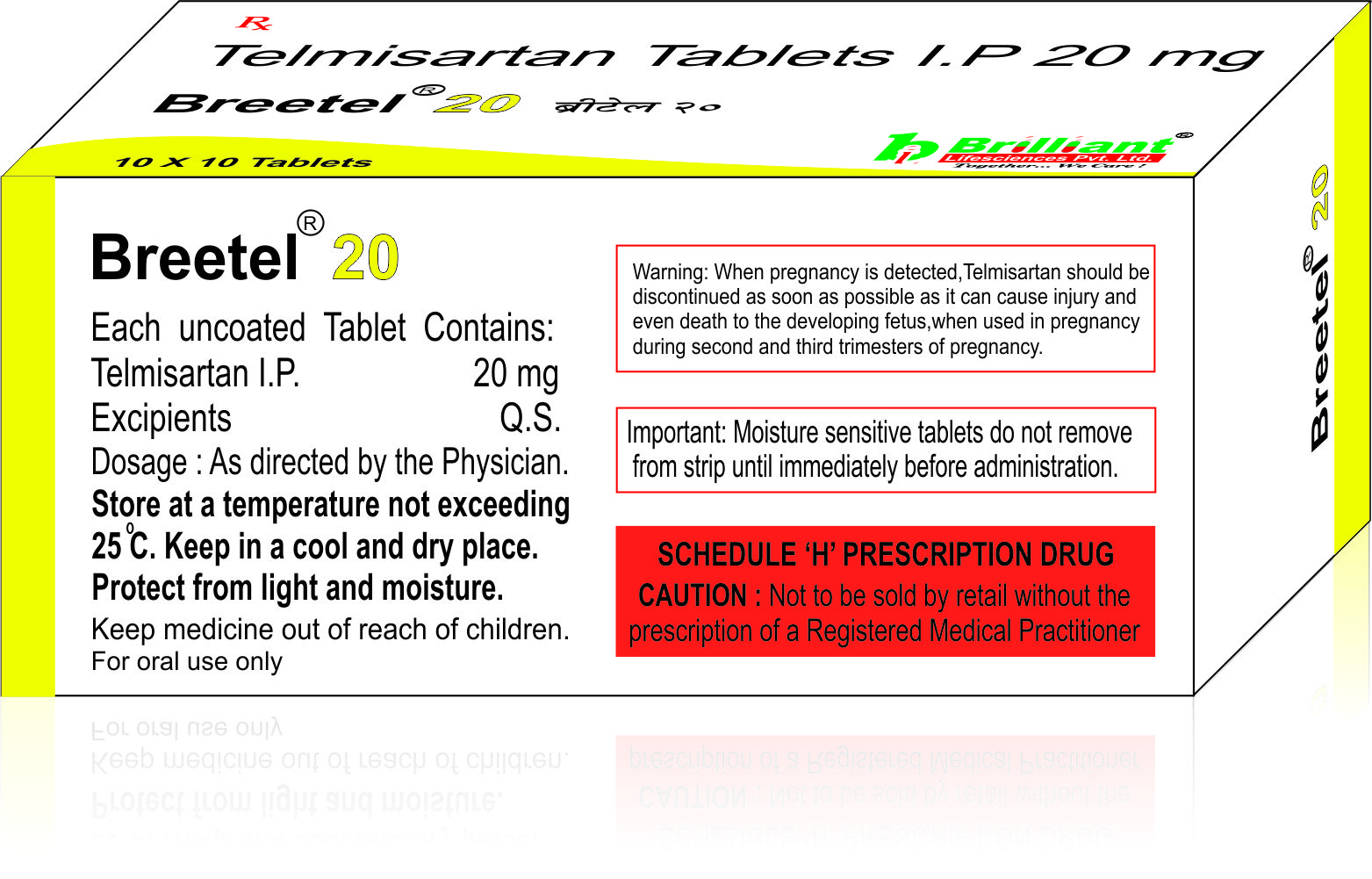 BREETEL 20 Tablet can be prescribed either alone or in combination with other medicines. It may be taken with or without food during the day or at night. However, try to take it at the same time each day to get the most benefit. It is important to continue taking it regularly even if you feel well or if your blood pressure is controlled. Most people with high blood pressure do not feel ill, but if you stop taking this medicine, your condition could get worse. This is a widely used medicine and is considered safe for long-term use.