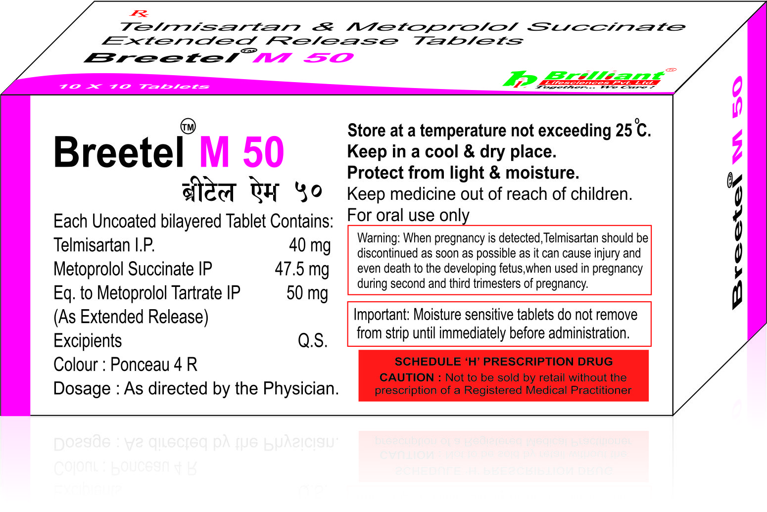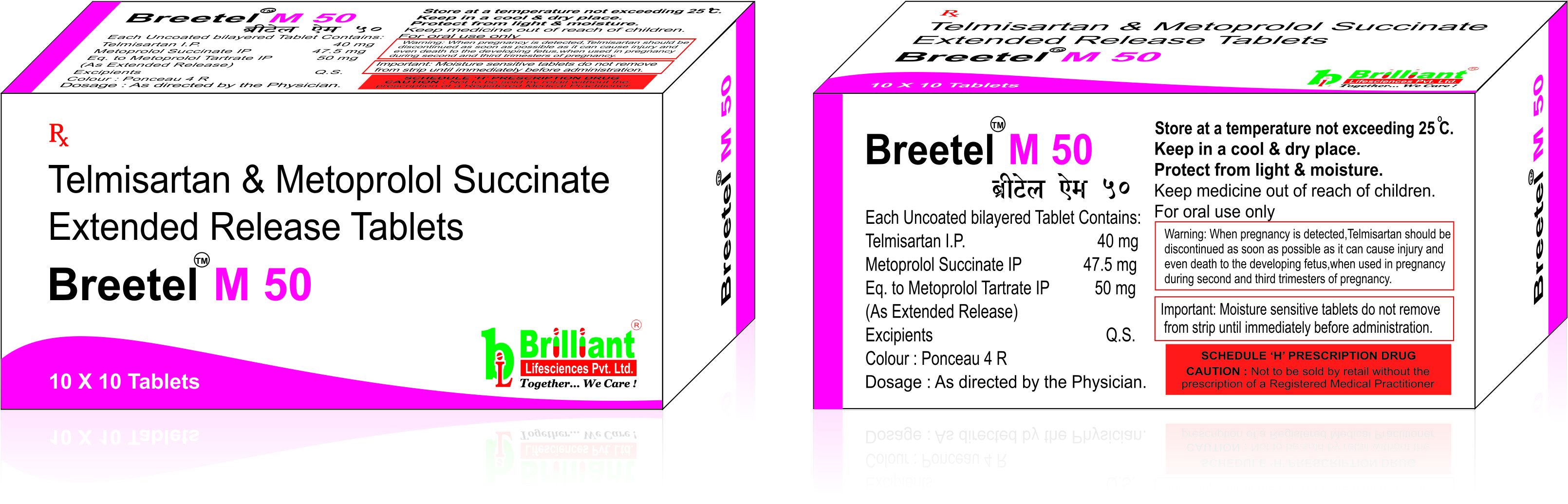 BREETEL M 50 Tablet is a combination of two blood-pressure lowering medicines: Telmisartan and Metoprolol Succinate.
