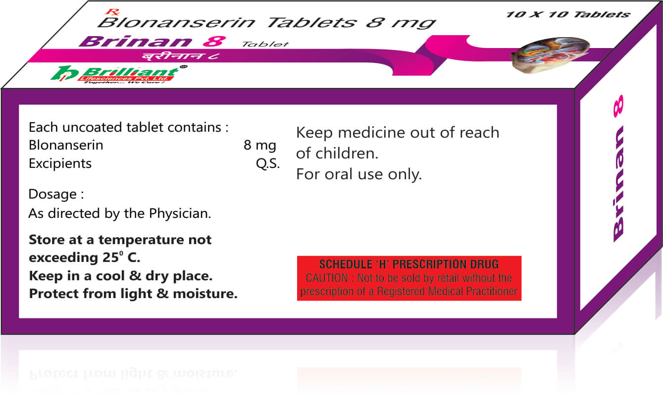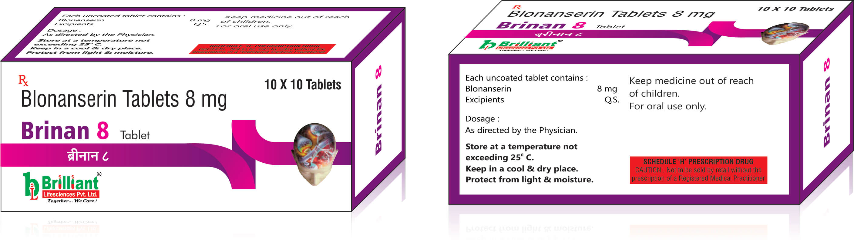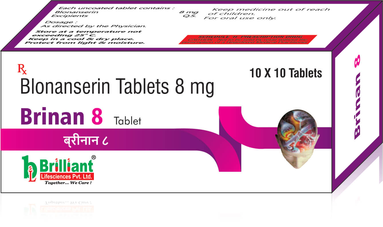 BRINAN 8 Tablet is used in the treatment of schizophrenia (a mental disorder that can result in hallucinations or delusions and also adversely affects a persons ability to think and behave) and mania. It can also be used to treat depression and bipolar disorders.