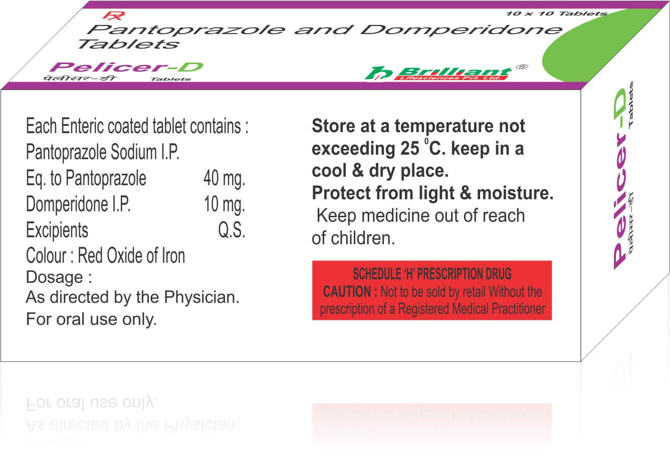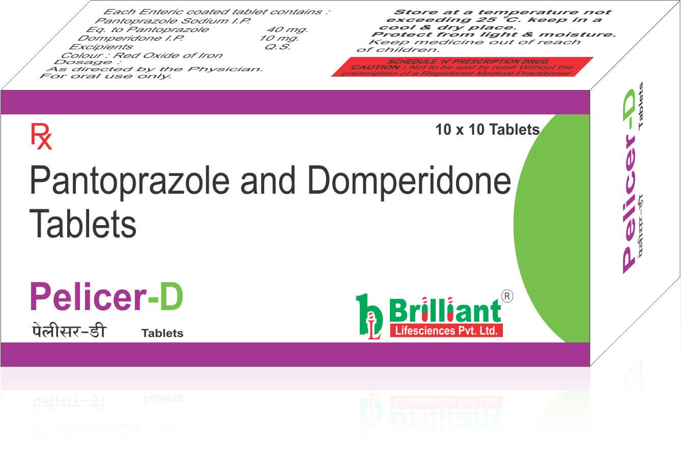Pelicer-D Pantoprazole and Domperidone Tablets is a prescription medicine used to treat gastroesophageal reflux disease (Acid reflux), dyspepsia (indigestion), and gastritis. It helps treat the conditions by reducing the amount of acid in the stomach thereby relieving symptoms of acidity such as heartburn, stomach pain, or irritation.